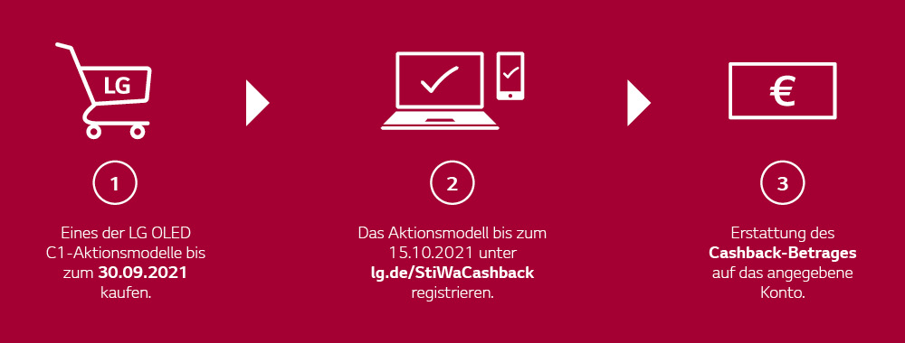 Nach Kauf eines Aktionsproduktes muss eine Registrierung unter https://www.service-lg.com/LG/StiWaCashback erfolgen.