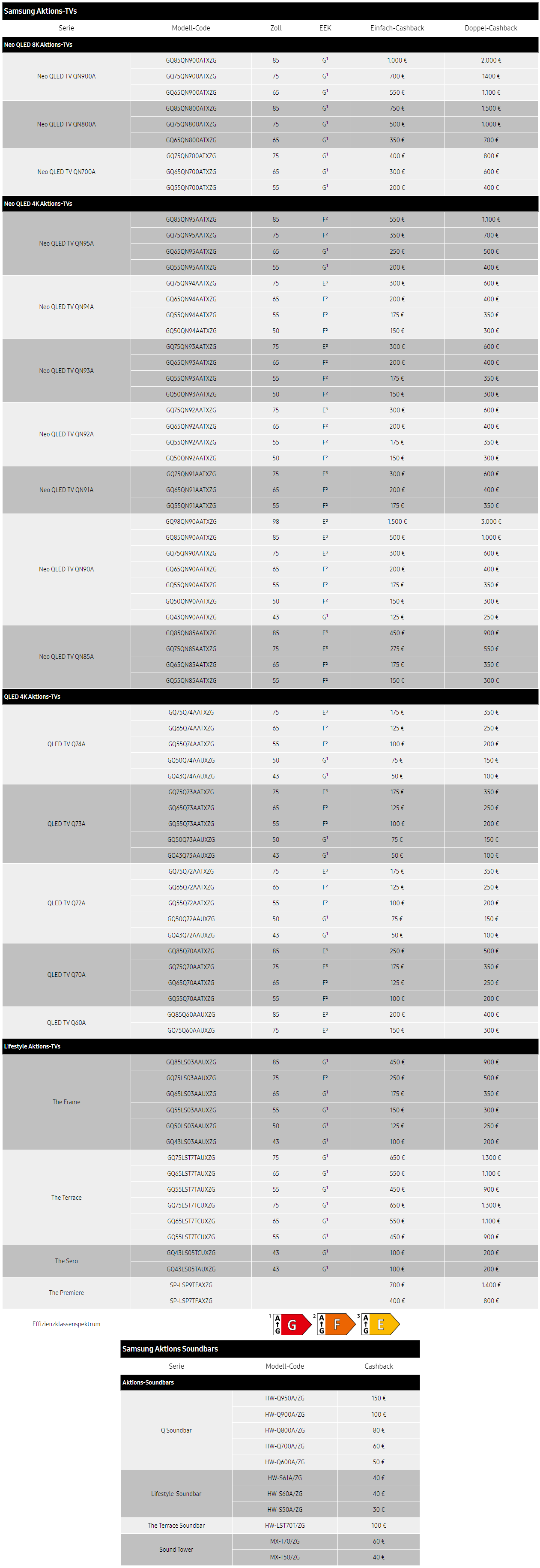 4 250 € Cashback beim Kauf eines Neo QLED GQ65QN95A oder 500 € Cashback in Kombination mit einer Soundbar. Der Cashback variiert je nach Aktionsgerät.