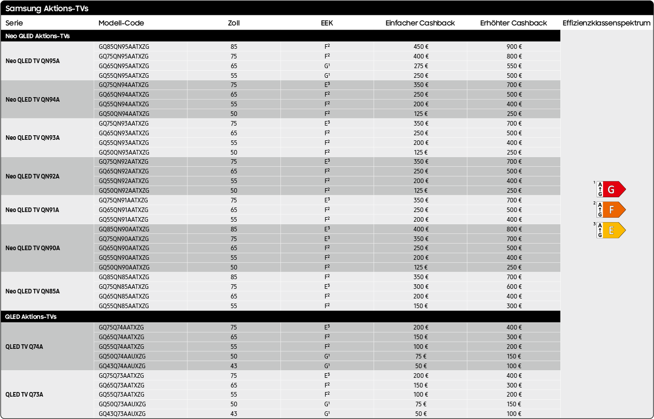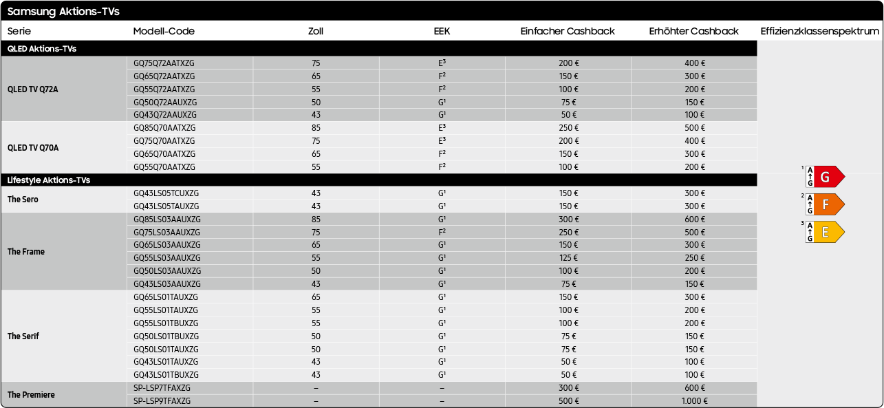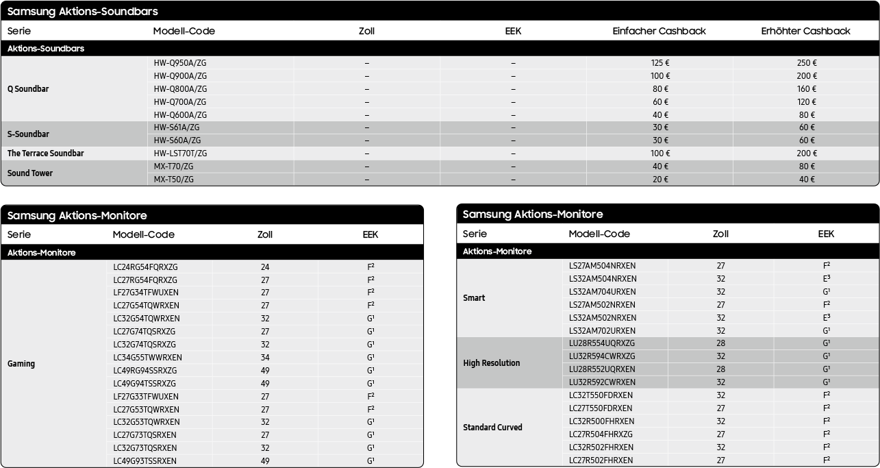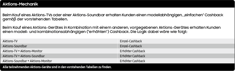 1* Nur für private Endkunden ab 18 Jahren beim Erwerb eines neuen Samsung TV- oder Soundbar-Aktionsgerätes mit bestimmtem länderspezifischem Modell-Code bei teilnehmenden Händlern in Deutschland oder im Samsung Online Shop unter samsung.com/de zwischen dem 18.08. und dem 28.09.2021 („Aktionszeitraum“). Kunden sind selbst dafür verantwortlich, dass die von ihnen erworbenen Geräte einen Modell-Code aufweisen, der zur Teilnahme an dieser Aktion berechtigt (für Details, Höhe des Cashback sowie Aktionsmodelle und Modell-Codes der Aktionsgeräte s. vollständige Teilnahmebedingungen). Beim Kauf eines neuen Samsung TV- oder Soundbar-Aktionsgerätes erhalten Kunden einen modellabhängigen Cashback. Beim Erwerb eines Aktions-TVs zusammen mit einem Aktions-Monitor, einer Aktions-Soundbar zusammen mit einem Aktions-Monitor oder eines Aktions-TVs zusammen mit einer Aktions-Soundbar bei teilnehmenden Händlern in Deutschland oder im Samsung Online Shop innerhalb des Aktionszeitraums erhalten Kunden einen modell- und kombinationsabhängigen Cashback, wobei sich der jeweils höhere Einzel-Cashback verdoppelt. Der jeweils niedrigere Einzel-Cashback des zweiten Aktionsgerätes entfällt in diesem Fall (sofern ein solcher gewährt worden wäre). Die jeweiligen Aktionsgeräte sind innerhalb der Produktkategorie frei wählbar. Bitte beachten Sie, dass für die Teilnahme sowohl Aktions-TVs als auch Aktions-Monitore und Aktions-Soundbars innerhalb des Aktionszeitraums erworben werden müssen. Die Aktionsgeräte können bei unterschiedlichen teilnehmenden Händlern und an unterschiedlichen Daten innerhalb des Aktionszeitraums erworben werden. Für den Erhalt des Cashback ist eine Registrierung der jeweiligen Aktionsgeräte bis spätestens 12.10.2021 (Ausschlussfrist) unter Angabe von Namen, Adresse, Kontoverbindung, E-Mail-Adresse sowie Seriennummer und Modell-Code plus Hochladen des Kassenbelegs (bei Erwerb im stationären Handel) bzw. der Bestellbestätigung und Rechnung (bei Erwerb im Online-Handel) unter samsung.de/gamingdeals erforderlich. Für die Registrierung eines Kombinations-Cashback (erhöhten Cashback) müssen beide Aktionsgeräte zusammen registriert werden. Ein Nachreichen der für die Registrierung erforderlichen Angaben ist nicht möglich. Die Überweisung des Cashback erfolgt in der Regel innerhalb von 45 Werktagen nach gültiger Registrierung. Solange der Vorrat reicht. Jeder Haushalt kann maximal mit jeweils zwei Aktionsgeräten pro Produktgruppe teilnehmen. Bei endgültiger Kaufrückabwicklung innerhalb von sechs Monaten ist der jeweilige Cashback zurückzuzahlen. Bei einem Kombinations-Cashback muss der gesamte Cashback zurückgezahlt werden, auch wenn der Kauf nur eines Aktionsgerätes endgültig rückabgewickelt wird. Samsung behält sich eine vorzeitige Änderung und/oder vorzeitige Beendigung der Aktion vor, insbesondere wenn das Budget ausgeschöpft ist. Samsung behält sich außerdem eine Verlängerung der Aktion vor, insbesondere für den Fall, dass Aktionsinhalte (wie Aktionsmodelle) geändert werden. Nicht kombinierbar mit anderen Aktionen, Gutscheinen, Zuschüssen, Boni oder Rabattaktionen von Samsung. Ausgenommen hiervon ist die Aktion Samsung Made for Germany für ausgewählte Samsung QLED Aktions-TVs (Details, Umfang sowie Aktionsgeräte unter samsung.de/madeforgermany). Aktion im Einzelnen, Liste der Aktionsgeräte inkl. aller Cashbacks sowie vollständige Teilnahmebedingungen unter samsung.de/gamingdeals. Ausrichter: Samsung Electronics GmbH, Am Kronberger Hang 6, 65824 Schwalbach/Taunus, Deutschland.