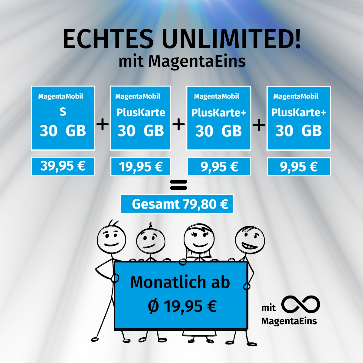 Wenn Sie zu einem MagentaMobil M- oder L-Tarif mindestens eine PlusKarte (ab 19,95 €) hinzufügen, erhalten Sie für alle Vertragskarten unbegrenztes Datenvolumen .