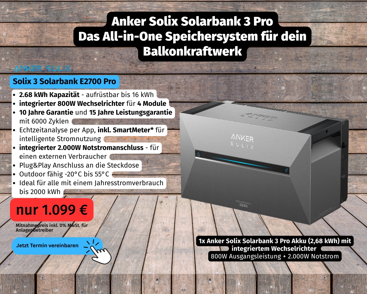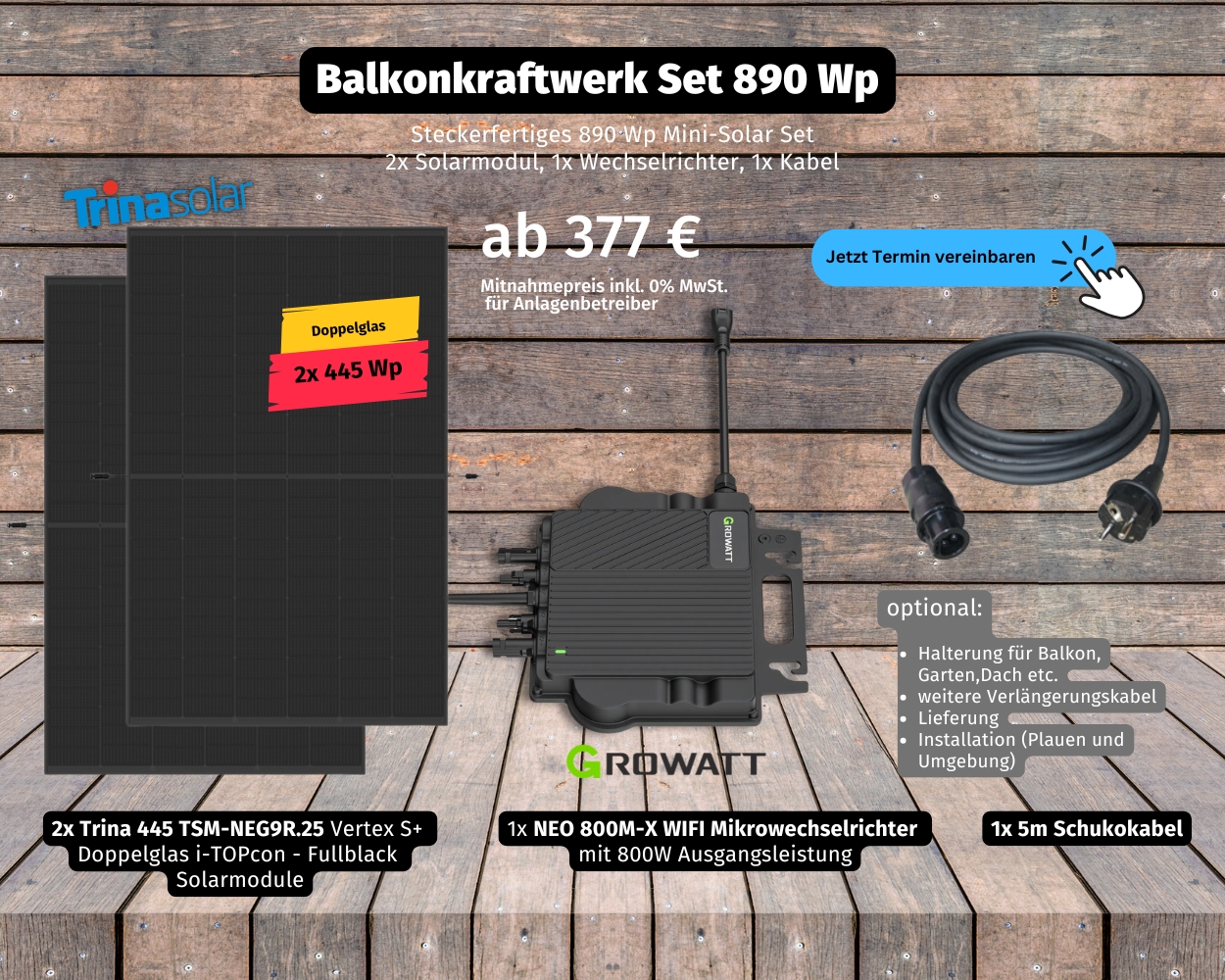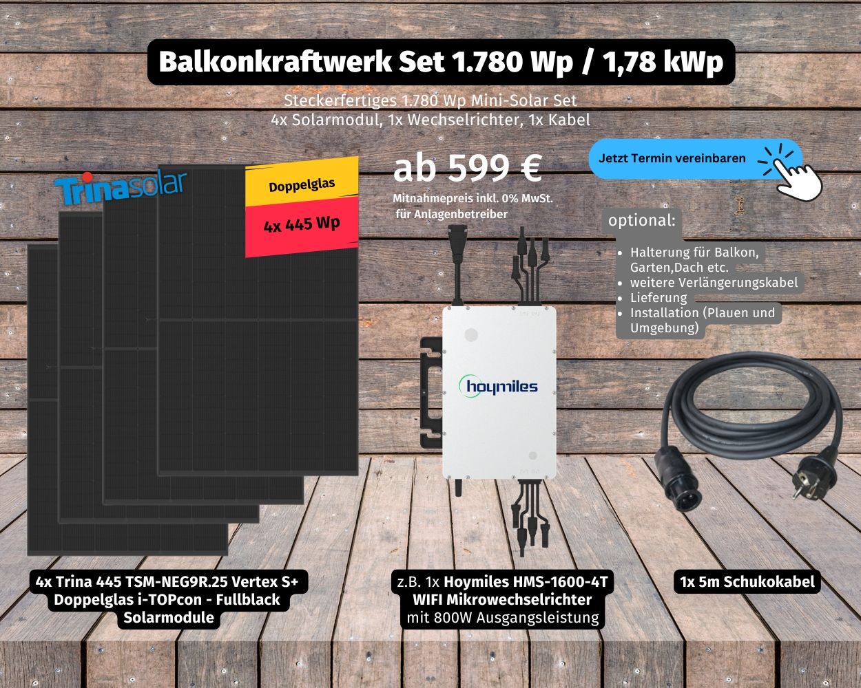 Grob gesagt: Ein Balkonkraftwerk besteht mindestens einem Solarmodul, einem Wechselrichter, Befestigungsmaterial und einem Kabel. Der Wechselrichter muss auf eine Leistung von 800 Watt beschränkt sein. Das ist die Obergrenze der Leistung, die ein Balkonkraftwerk in Deutschland erbringen darf, wenn es direkt an der Steckdose genutzt werden soll. Liegt die Leistung höher, muss eine Elektroninstallation erfolgen.