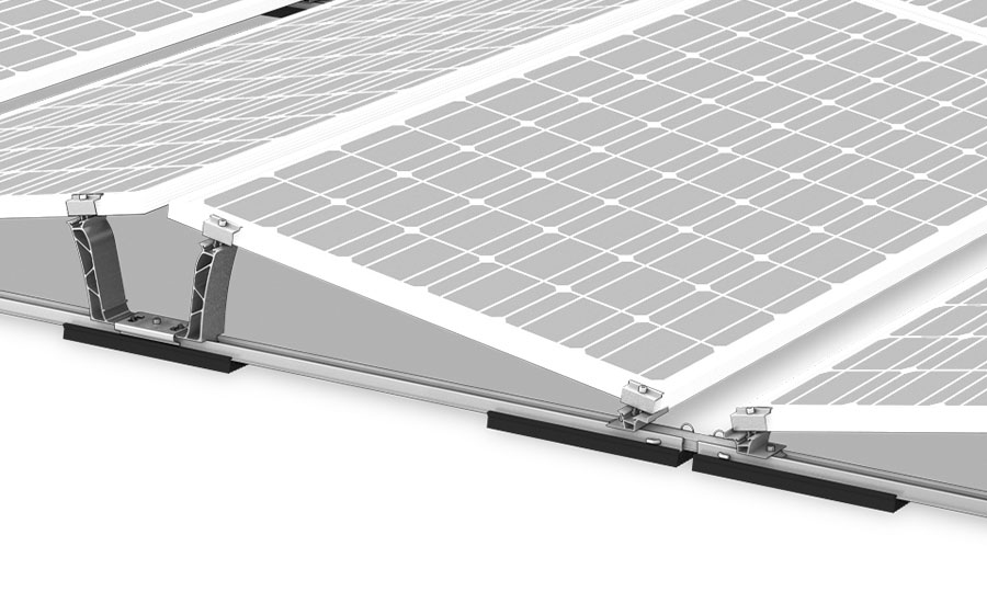 Das Base Set L von K2 Systems eignet sich für Modulbreiten von 1061 bis 1170 mm. Es ist Teil des D-Dome Flachdachsystems mit Ost-West-Aufständerung.