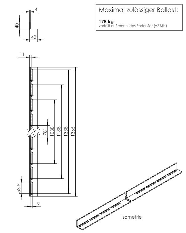 Ballastierungen für K2 Dome 6 Systeme. Maße: 1365x40x40 mm. Maximal zulässiger Ballast: 178 kg (verteilt auf 2 montierte Dome Porter Flex). Passend für Modulbreiten 1320 mm