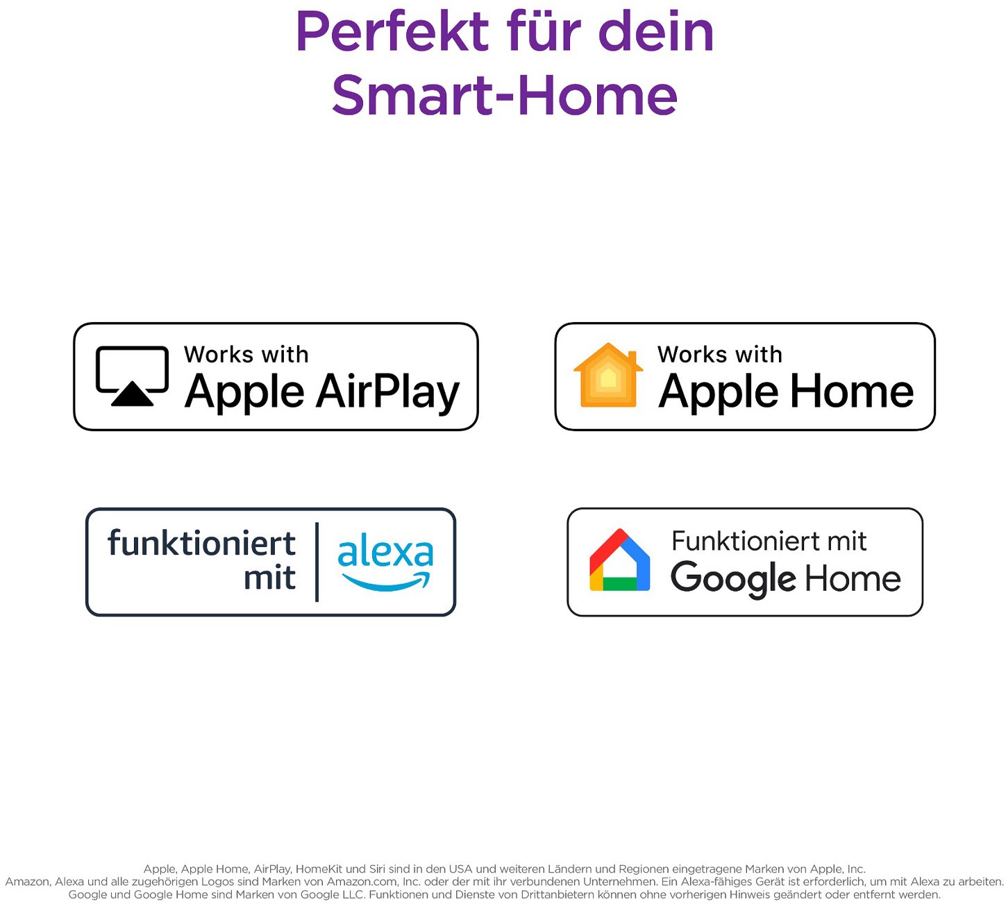 - Unterstützt alle gängigen Sprachassistenten: Apple AirPlay, Apple Home, Alexa, Google Home