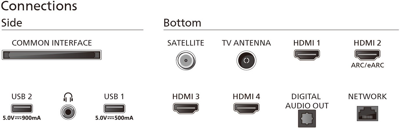 - DVB-T2/-C/-S2 Triple Tuner, 4x HDMI, HDMI 2.1, 2x USB, CI+, Digitaler Audio-Ausgang (optisch), Ethernet-LAN, WLAN 802.11ac, 2 x 2 Dualband & Bluetooth 5.2 integriert