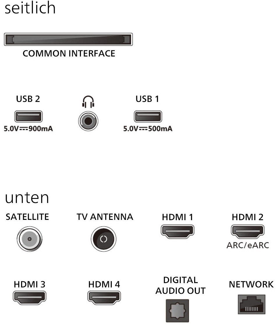 - DVB-T2/-C/-S2 Triple Tuner, 4x HDMI (eARC auf HDMI 2), HDMI 2.1, 2x USB, CI+, Digitaler Audio-Ausgang (optisch), LAN, WLAN 802.11ac (2x2 Dualband) & Bluetooth 5.2 integriert