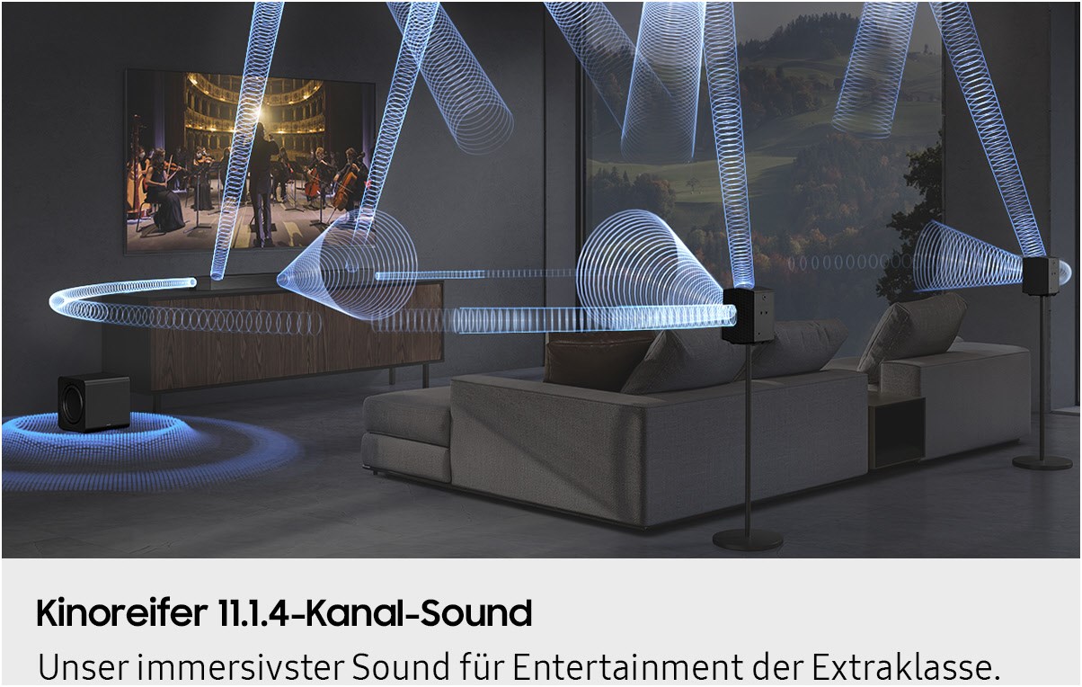 Erlebe ein beeindruckendes 11.1.4-Kanal-Sound-Erlebnis, bei dem dich 11 Kanäle, 1 Subwoofer-Kanal und 4 nach oben abstrahlende Kanäle vollständig in Sound einhüllen.